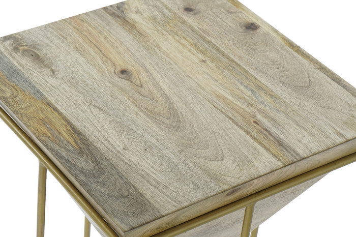 A mangófa gazdag, természetes erezetével egyedi karaktert ad minden darabnak, míg az aranyszínű fém lábak elegáns, fényűző megjelenést biztosítanak. A két anyag találkozása harmonikus, így ez a kisbútor tökéletes választás modern, skandináv, ipari vagy bohém enteriőrökbe is.