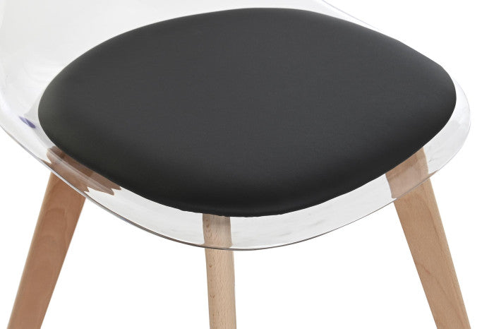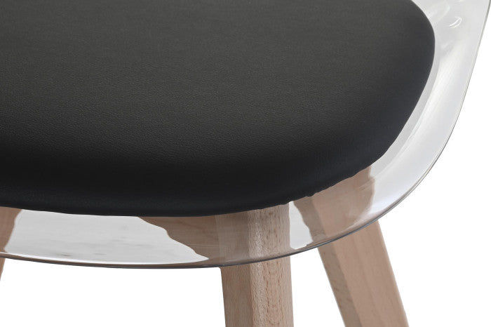 Ez a fekete-natúr modern szék kiválóan ötvözi a minimalista dizájnt és a természetes anyaghasználatot. A polikarbonátból készült fekete ülőfelület elegáns, mégis időtálló, miközben a tömör fa lábak melegséget és stabilitást adnak az összképhez.