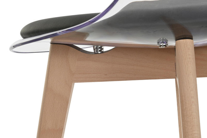 Ez a szék ideális választás azoknak, akik a letisztult, modern vonalvezetést kedvelik, de nem akarnak lemondani a természetes anyagok nyújtotta otthonosságról. A fekete polikarbonát és natúr fa kombinációja markáns, mégis harmonikus megjelenést eredményez.